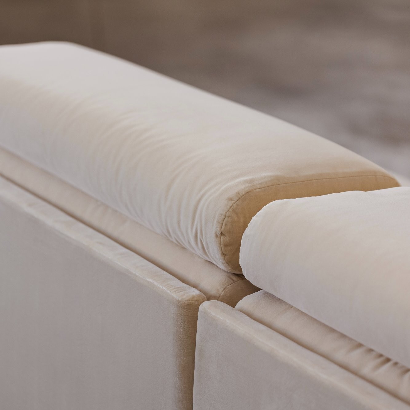 The horizontal seat surface is composed of a polyurethane foam base incorporating a flexible structure made from cut sheets of marine plywood. On either side of this base, slim side panels—padded with foam and finished with an outer cover—serve as the sole support for the back and armrest cushions.