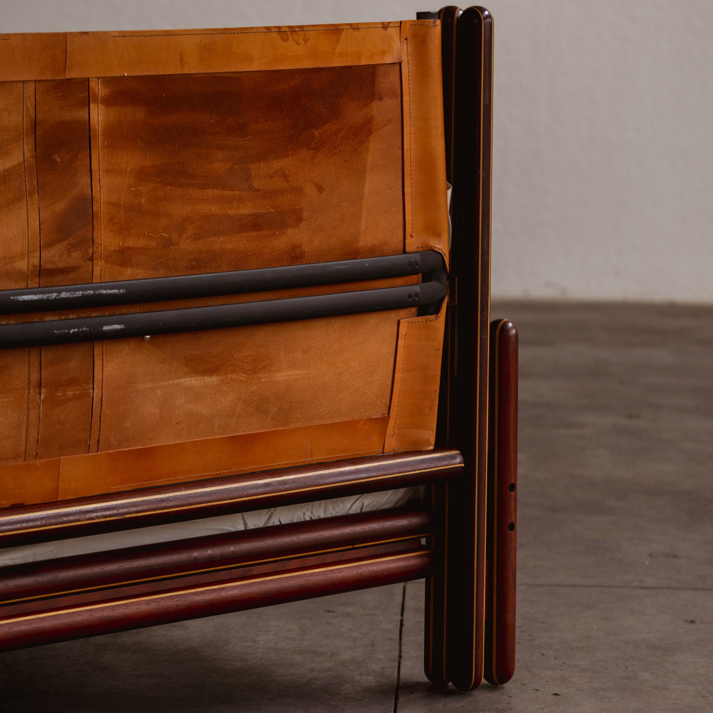This Carlo Scarpa bed expresses his great passion for architecture and symmetry. The great Italian master originally conceived the bed from a formal idea described in a freehand color drawing done on yellow tissue paper and dedicated to a family friend. The “Toledo” bed develops a supporting structure in solid wood with lighter wooden inserts, showing essential and elegant lines in the typical Scarpa style. The thin and rounded edges counterbalance the apparently sturdy aspect, enhancing the rich materials and the elegant lines. The headboard is made of original leather and is linked to the base with a bronze joint that allows a slight oscillation, allowing the adjustment of the position of the head or the back of the person who leans on that.