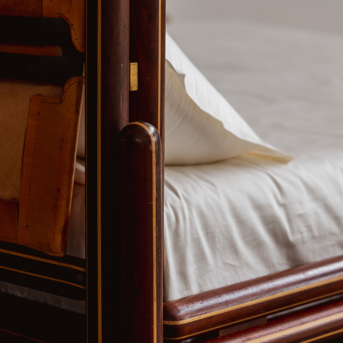 Carlo Scarpa “Toledo” Bed for Simon Gavina, maple, brass, leather, Italy, 1975.