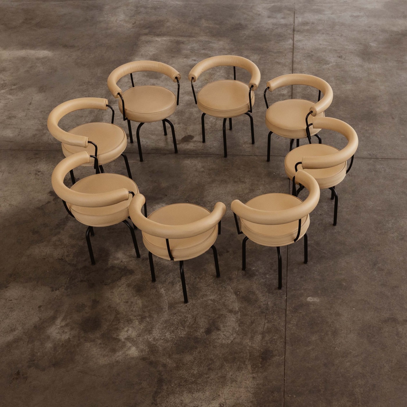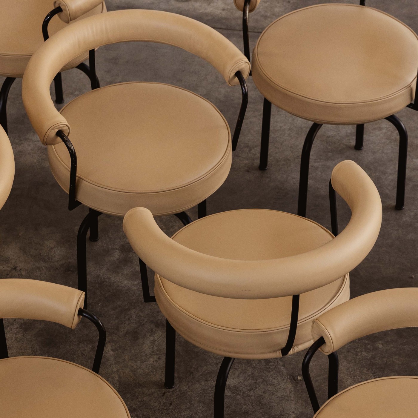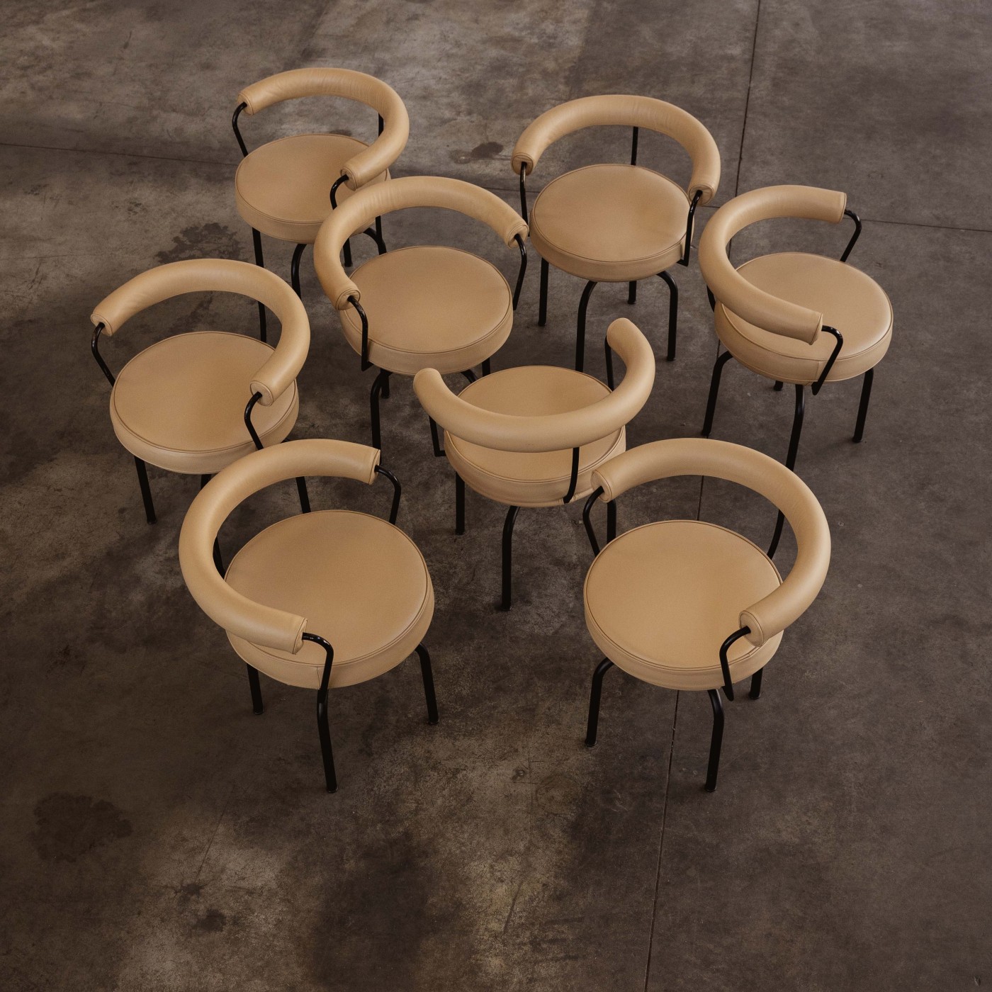 Charlotte Perriand, Pierre Jeanneret and Le Corbusier “LC7” dining chairs for Cassina, sand beige leather, black metal, Italy, 1927, set of eight.