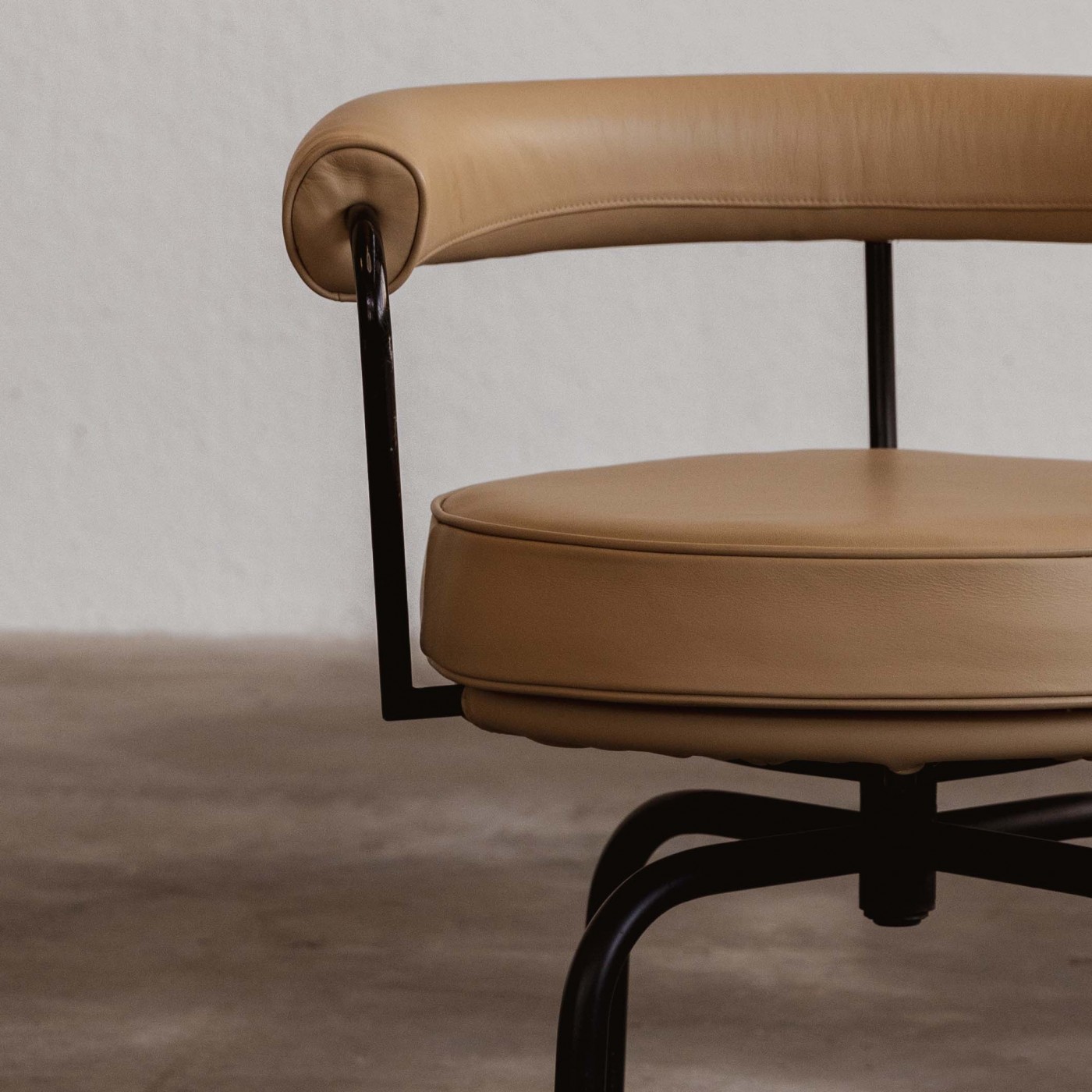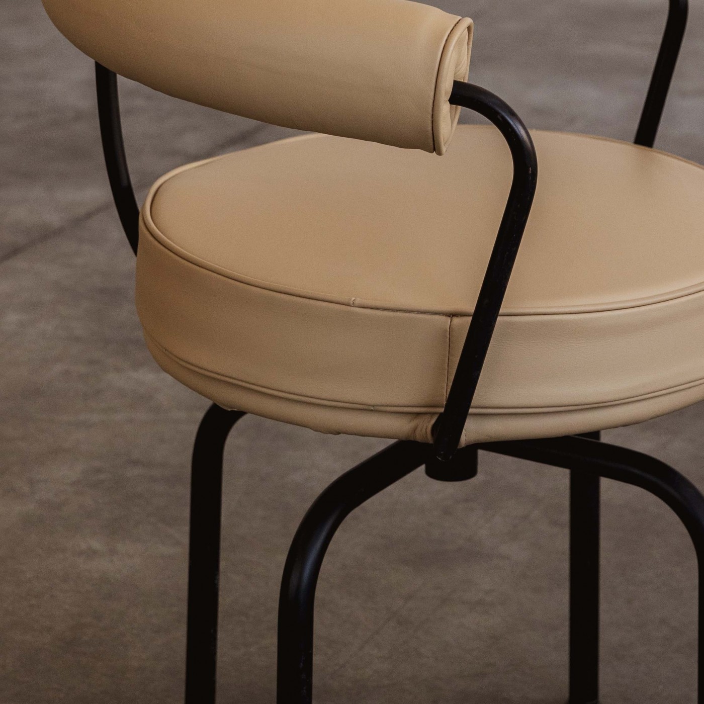 An icon with a versatile and functional soul, the “LC7” was designed in 1927 by Charlotte Perriand for her own apartment in the Place Saint-Sulpice in Paris. First exhibited at the 1928 Salon des Artistes Décorateurs, it was also shown at the Salon d’Automne one year later, where it formed part of a collection that Charlotte Perriand co-created with Le Corbusier and Pierre Jeanneret. Reupholstered in prime quality sand beige leather, this swivel chair features a four-legs chromed structure as well as an expanded polyurethane and padded polyester filling for back and seat.