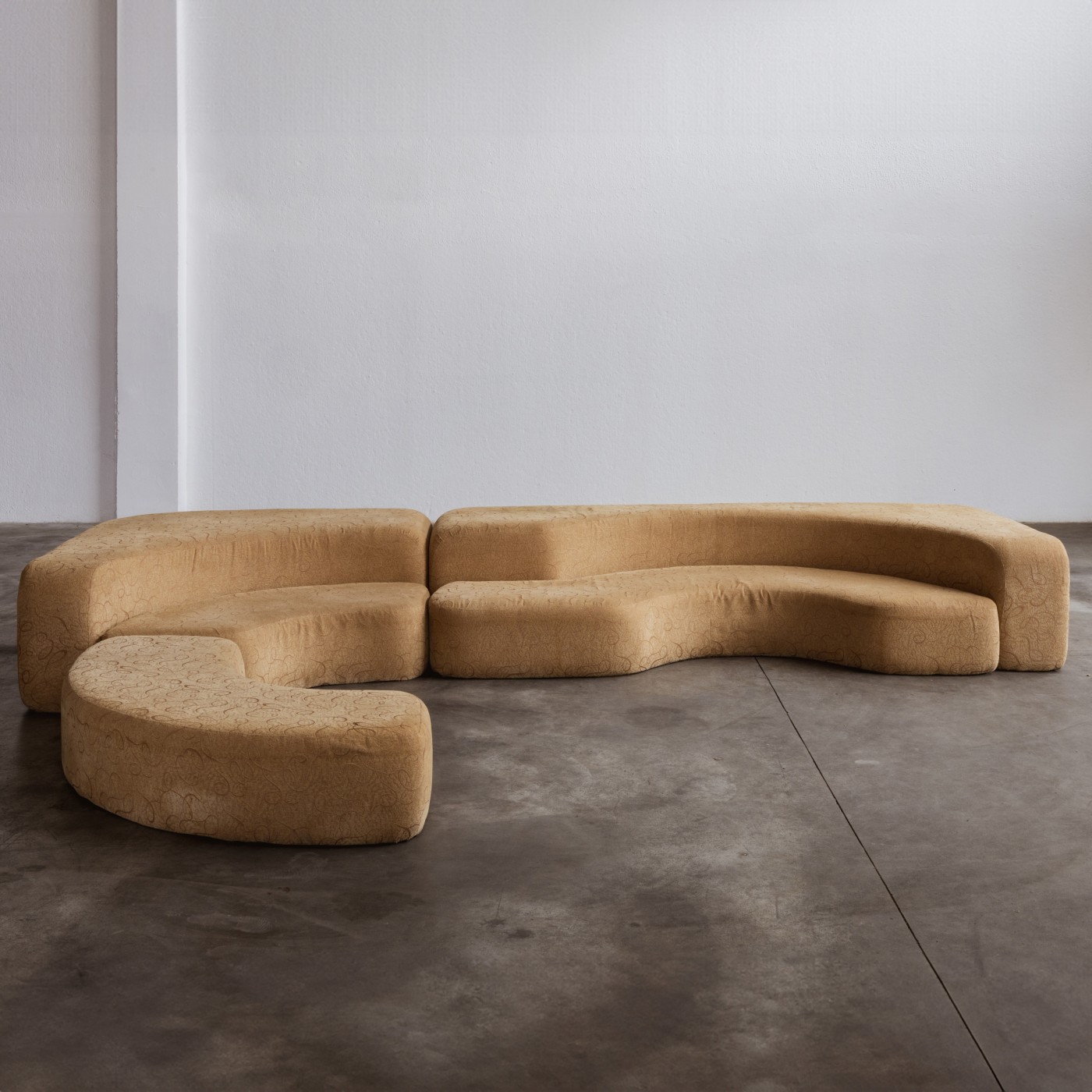 The Ennio Chiggio “Environ” sofa for Niko International, designed in the 1960s, is a rare and exquisite piece of Italian design. This large modular sofa comprises five elements made from polyurethane foam, covered in a soft, patterned fabric. The sofa’s generous, rounded lines and low backrest are upholstered in a distinctive fabric. The modular components can be easily reconfigured using its discrete straps, allowing for versatile seating arrangements.