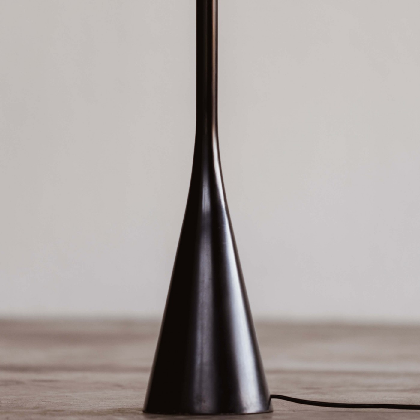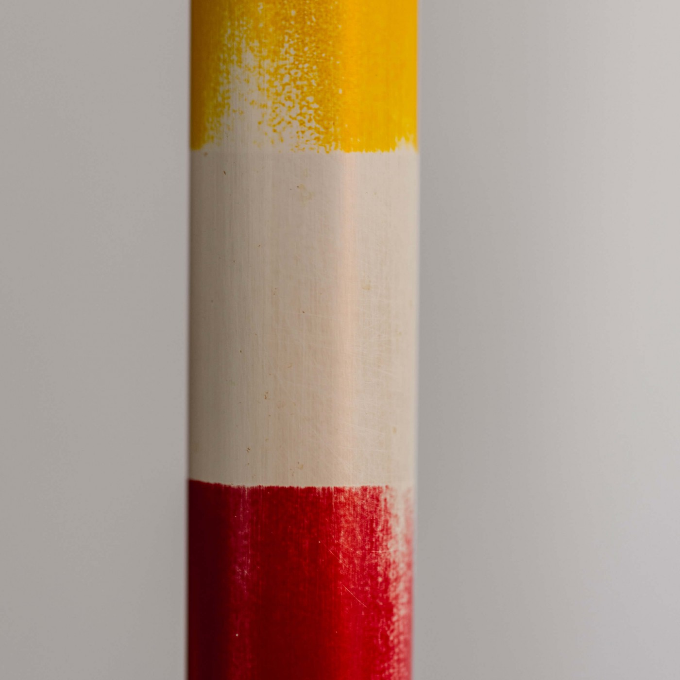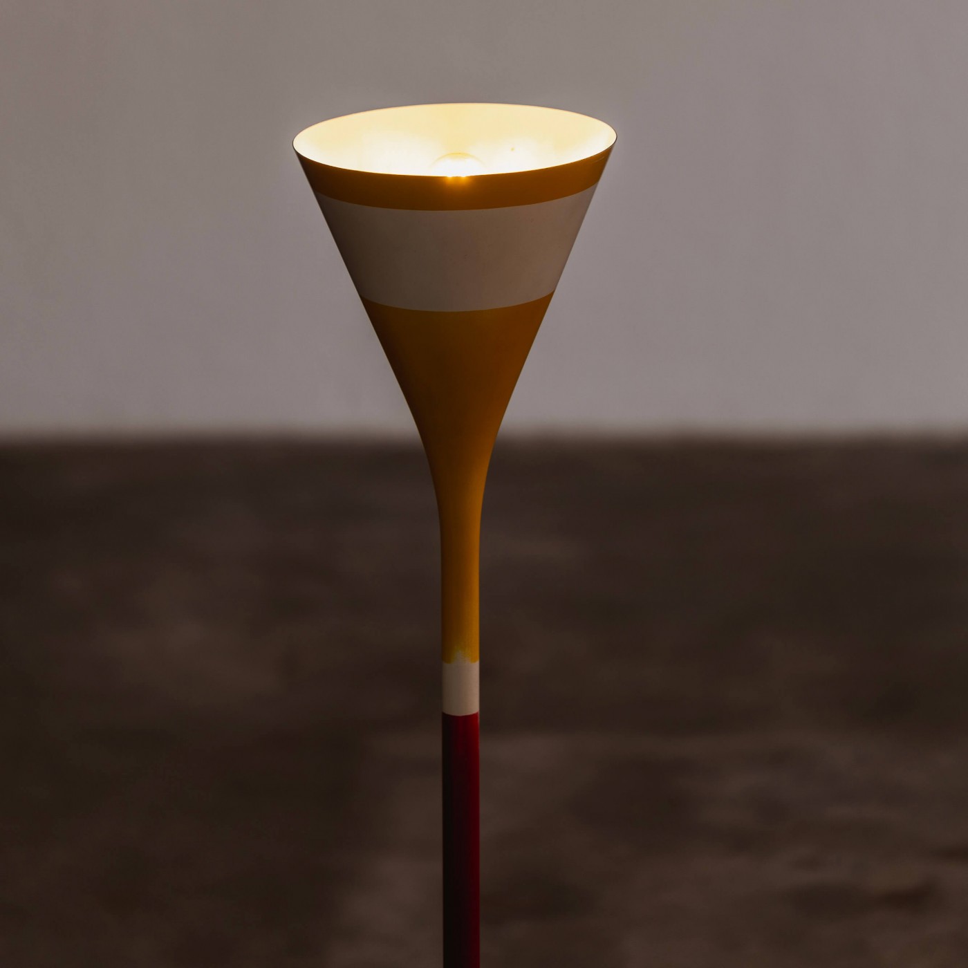 The “12731” Floor Lamp, designed by Ettore Sottsass for Arredoluce in 1956, is a striking example of mid-century modernism’s evolution. This lamp features a tubular frame and a conical base and shade. Its enameled aluminum finish, with bold black, white, red, and yellow hand-painted stripes, evokes the aesthetic of early electrical components such as resistors. The design exudes a minimalist, industrial charm, amplified by its uplight function and hidden fastenings, which preserve the integrity of its sleek form. A distinctive detail of this lamp is the symmetrical coned-shaped end and back that define the shape of the piece from the bottom to the top. Although designed in 1956, the “12731” floor lamp serves as an early precursor to the Postmodern Memphis Group, a creative collective he founded later in the 1980s. In the lamp’s hybrid nature, both sculpture and light source Ettore Sottsass captured a revolutionary moment in design history. Its tactile, colorful strokes prefigured the future of design, where art and function no longer stood in opposition.
