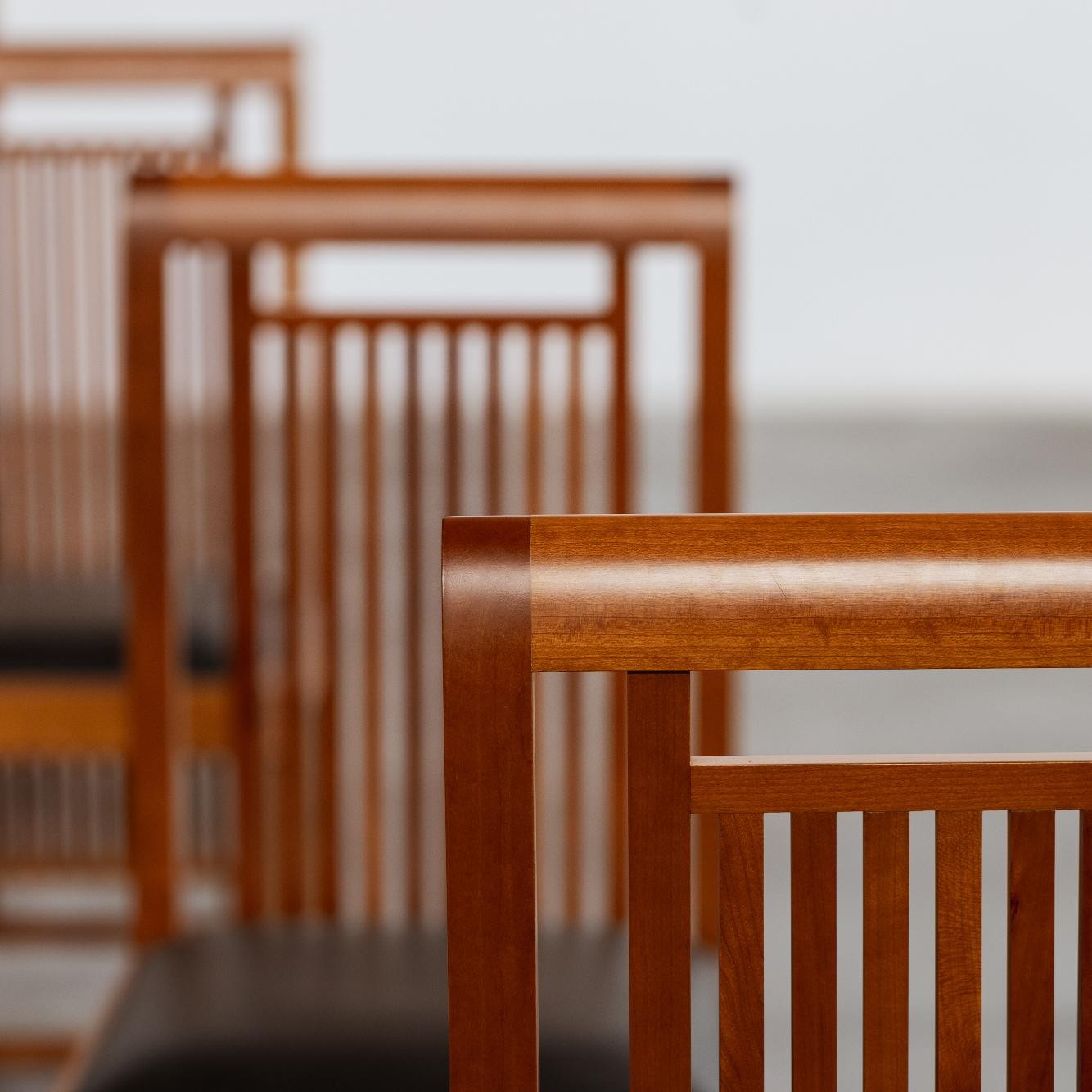 The “Coonley 2” chairs feature narrow vertical spindles connected to a broad crest rail extending to the bottom of the rear legs. The chairs have all-around geometric moldings reminiscent of Hellenistic triglyphs and columns. The legs are square and slightly curved at the bottom, adding a subtle elegance to the design. When placed around a table, the tall backs of the chairs create a “room within a room,” or technically, the Droste effect, enhancing the dining area’s movement.