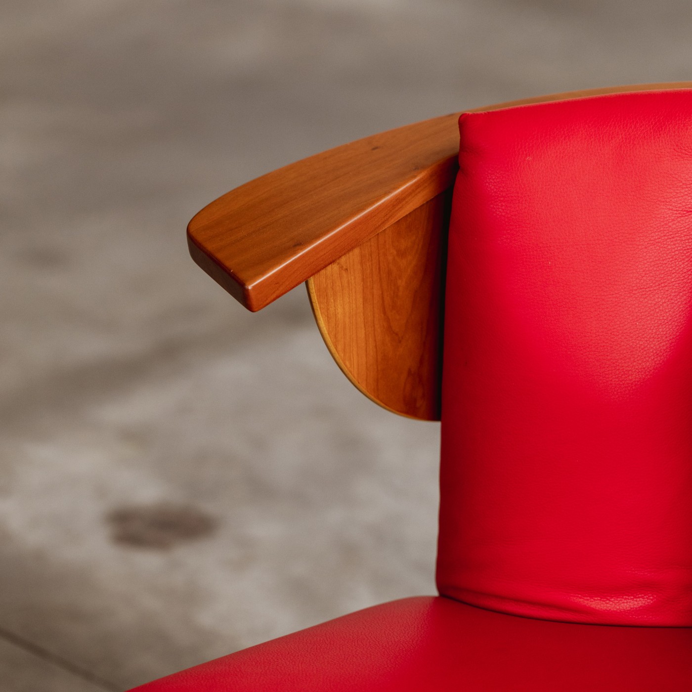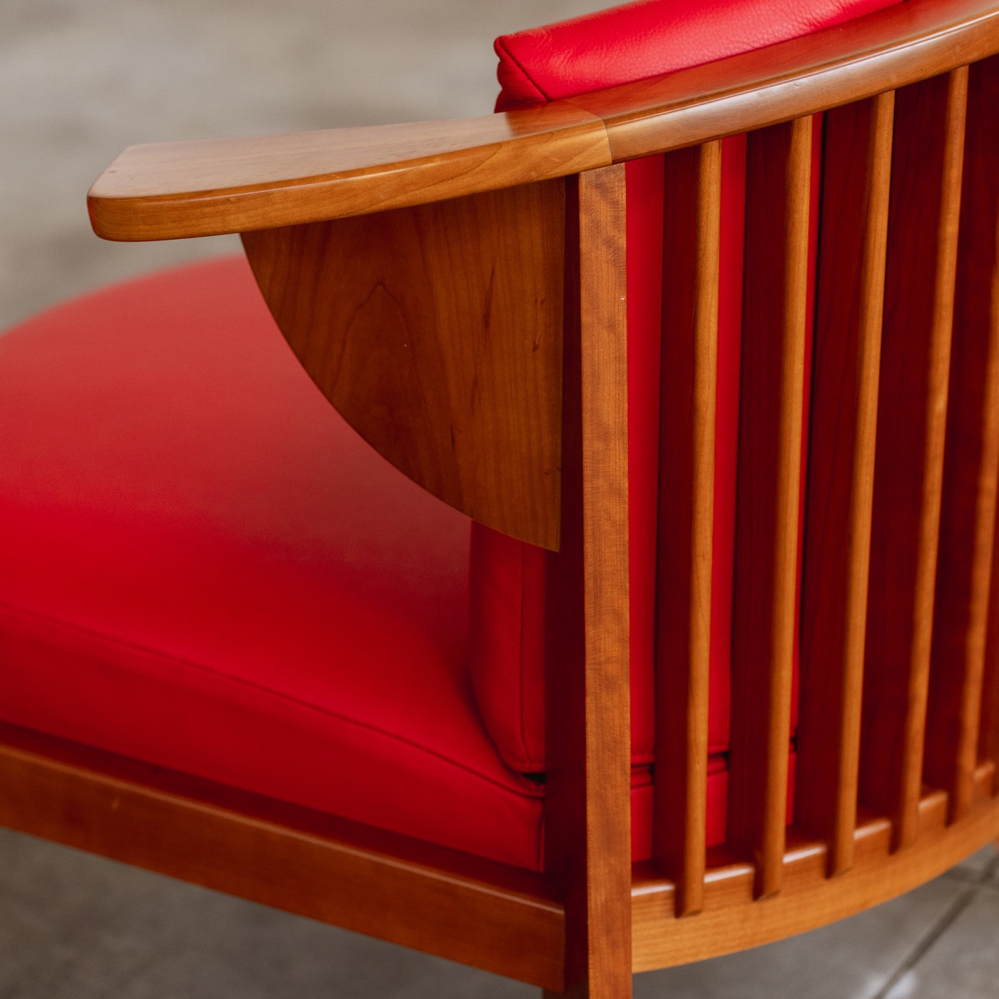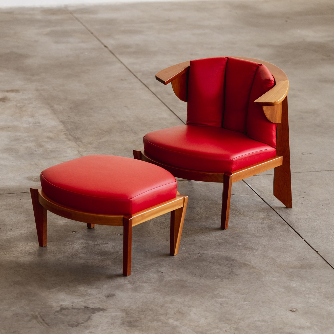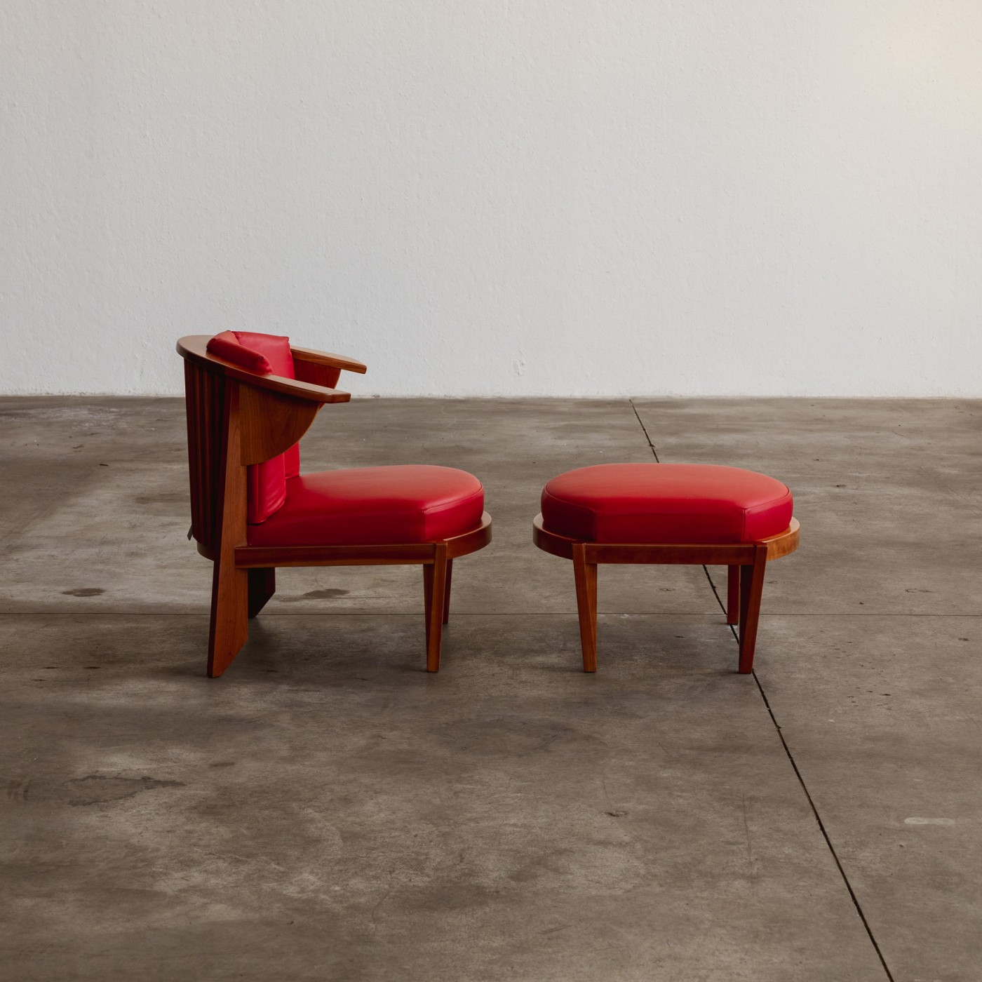 The Friedman armchair and ottoman, designed by Frank Lloyd Wright, reflect his iconic Usonian principles of simplicity, functionality, and harmony with nature. Upholstered in red leather, the chair and ottoman feature a natural American cherry wood frame with visible grain, finished in clear varnish. The chair’s wing-like geometries, rear leg design, and vertical cross-rails are architectural in nature, echoing Wright’s approach of integrating furniture with the overall structure of the home.