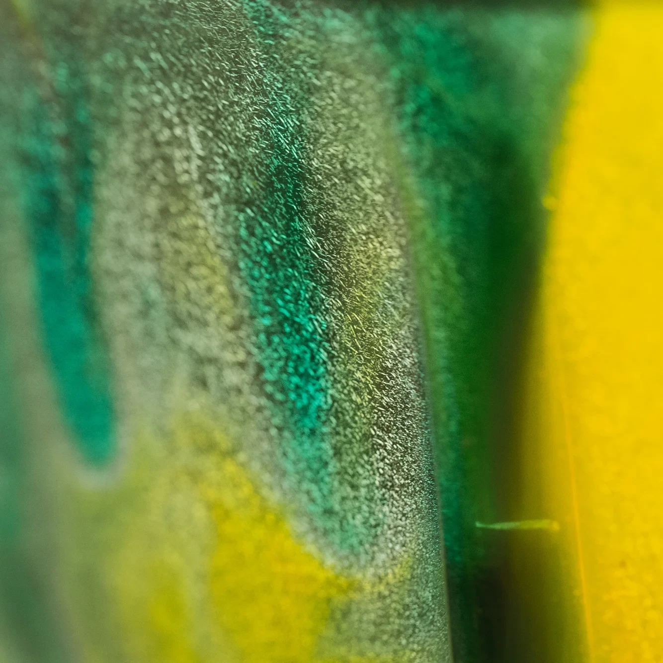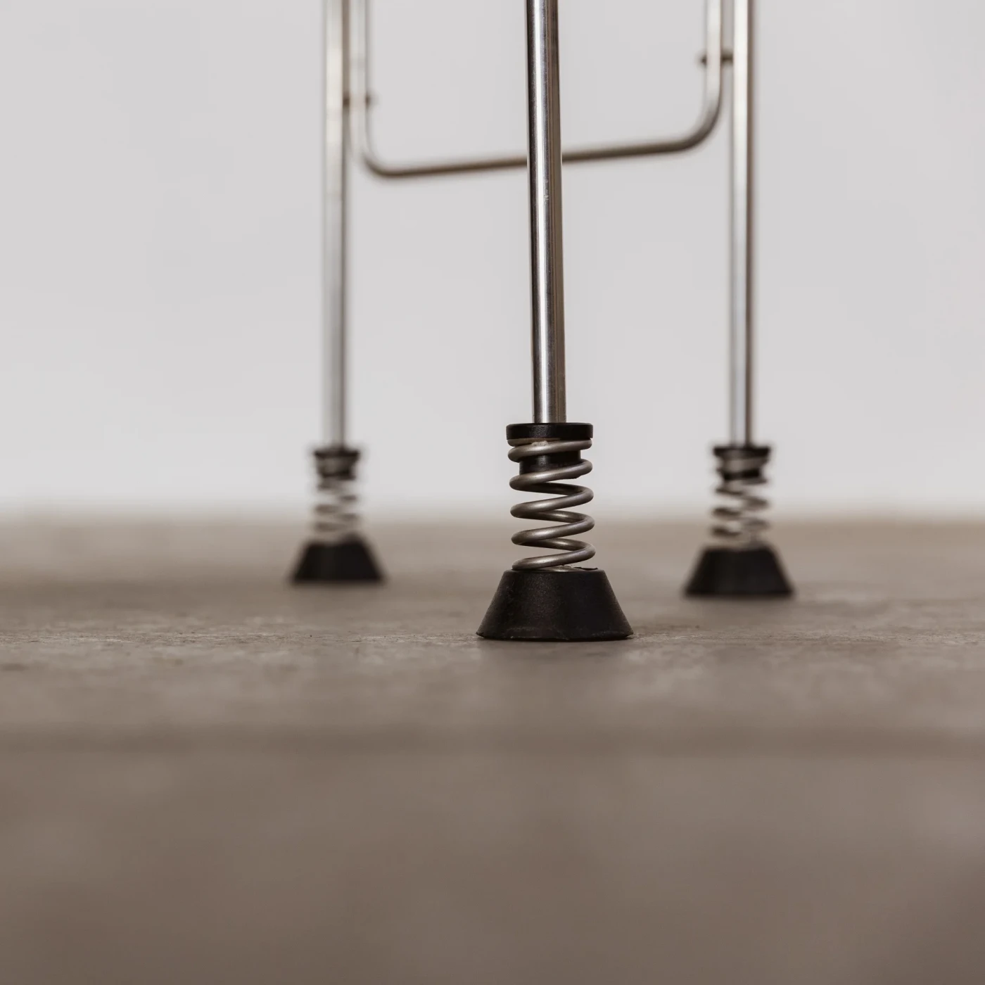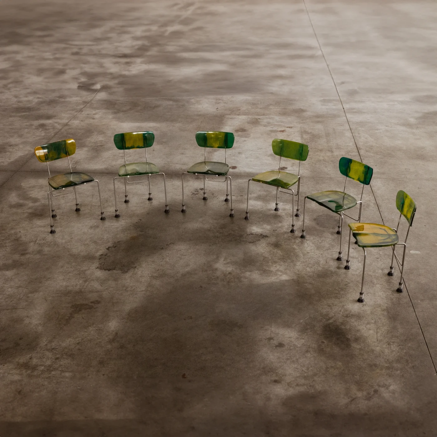 This revolutionary chair represents Pesce’s refusal of static and rigidity for cheerful variable solutions. The spring feet and the flexible brushed steel frame allow you to swing gently and rest. The resin seat and backrest feature different marmoreal green, blue, and yellow hues. Each “Broadway” chair is a unique piece of art: the colors interacted with one other and the resin and placed in unexpected shapes in the production stage, creating enchanting chromatic compositions. All the chairs are marked with the Bernini logo underneath.