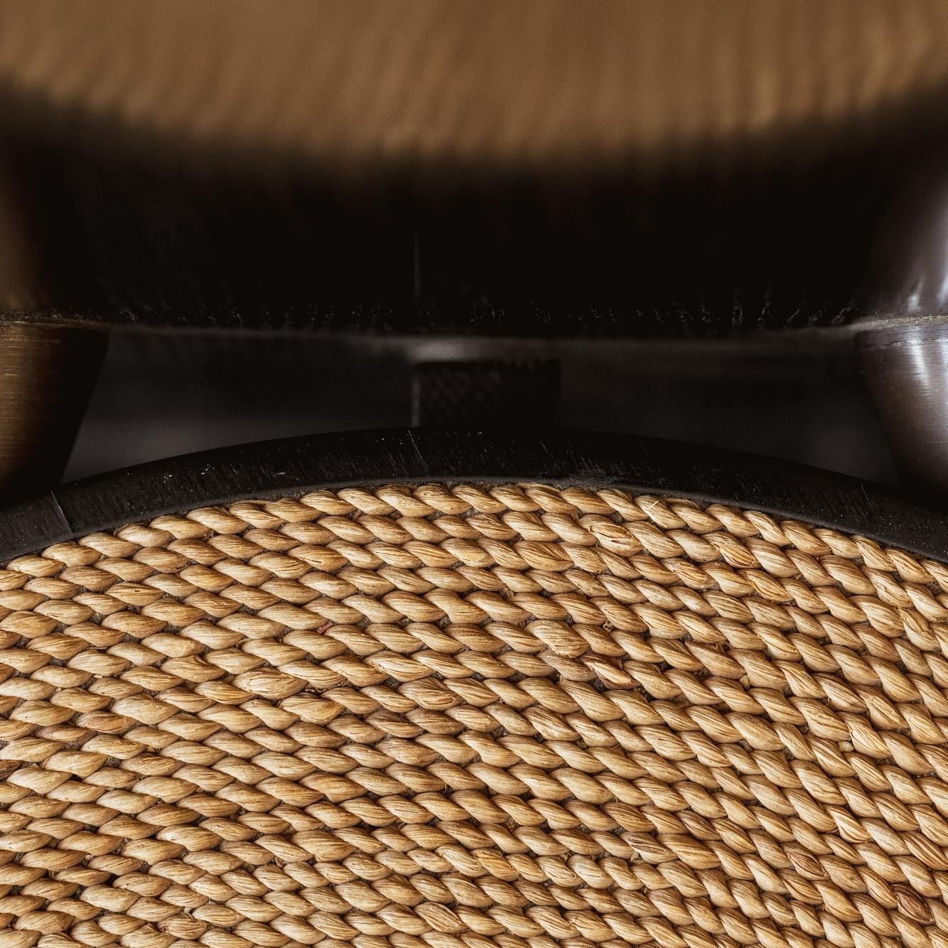 Designed in 1973 by Italian architect and designer Gigi Sabadin, the “Pala” chairs embody the radical experimentation of the Italian Seventies. Their structure reduces the archetype of a chair to an essential gesture: two vertical planes intersected by a suspended circular seat in woven straw. The stark black lacquered wood, resting on a double-base support, highlights the tension between geometric rigor and the organic tactility of natural fiber.