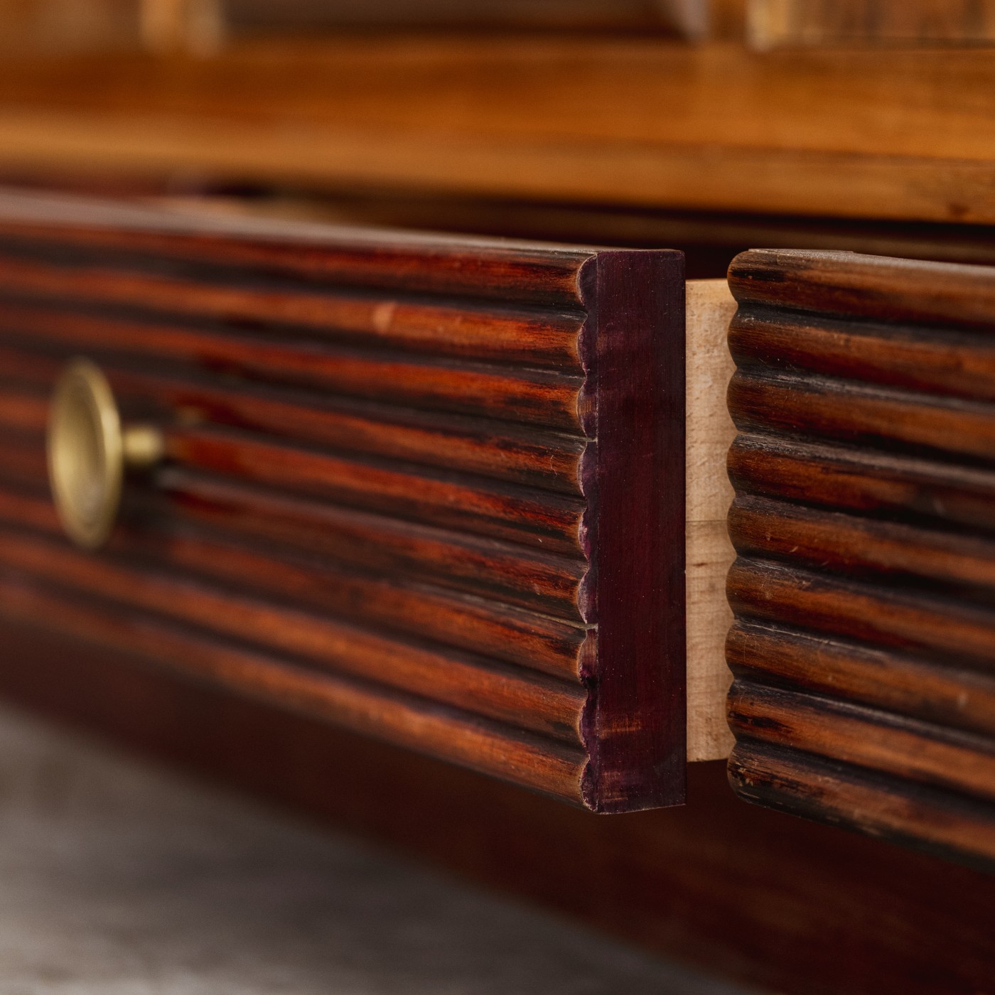 The cabinet features a combination of materials and finishes, showcasing Ponti’s mastery of woodwork. The lower section includes four drawers with fine rounded slatted fronts, stained with aniline dye, and finished with round recessed knobs. The middle section has five doors, three in wood and two in glass, concealing symmetrical shelves. The top section offers open shelving, ideal for displaying decorative items.