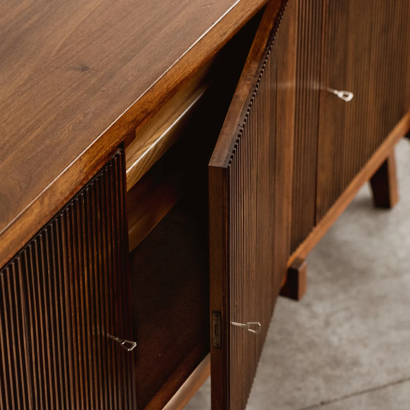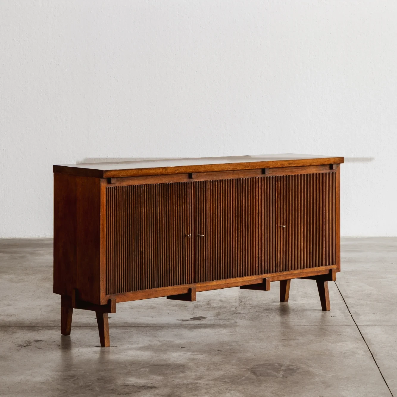 Designed by Guglielmo Ulrich in 1950, this mid-century sideboard reflects a shift from his earlier neoclassical style toward modernist rigor. Built in solid wood, it features three flush-panel doors with fine reed-like textures, expressing Ulrich’s refined sense of proportion and surface rhythm. Inside, two floating drawers in the upper left bay offer an uncommon yet functional layout. Departing from decorative flourishes, the piece embraces stricter geometries akin to the architectural approach of Paolo Buffa. Elevated on a rectilinear frame with recessed feet, it balances structural solidity with visual lightness. Each modular section supports versatile storage needs for domestic or studio settings.