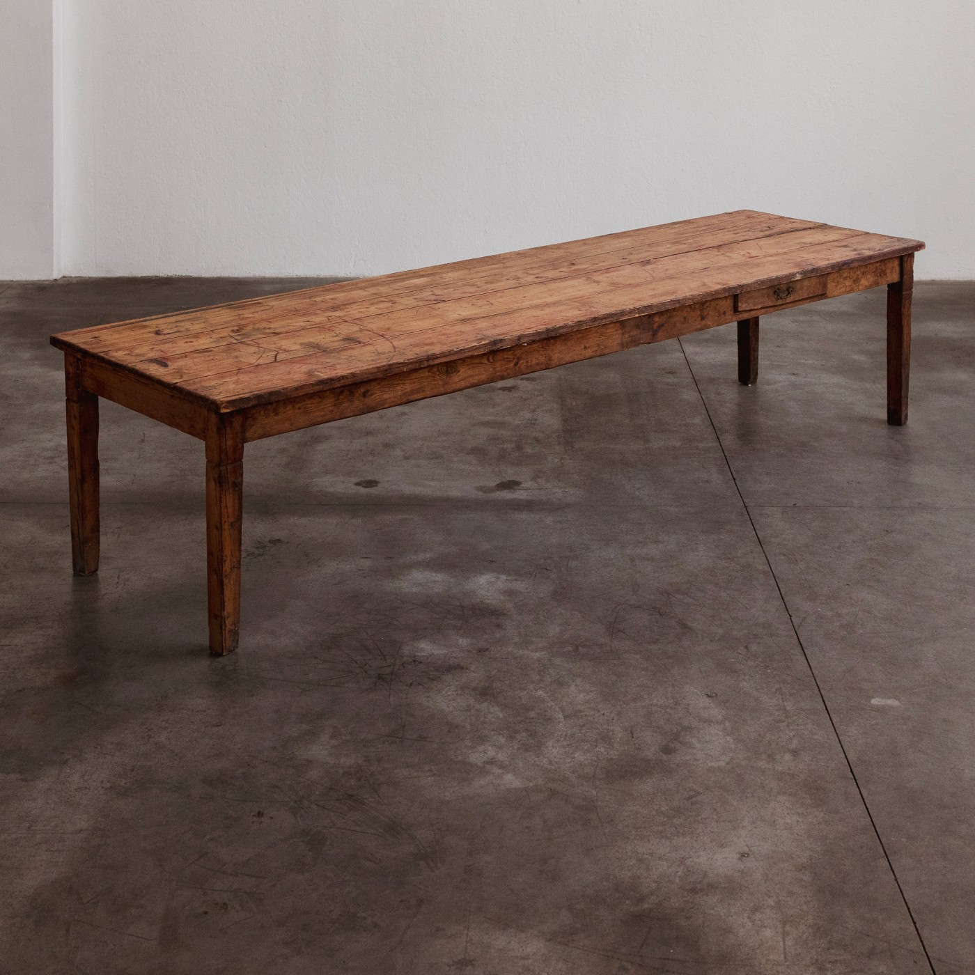 This solid French farmhouse table exemplifies rustic craftsmanship with a design that is both functional and enduring. Constructed from solid wood, the tabletop features four full-length planks, uninterrupted by crosspieces, emphasizing its clean and robust design. The table’s apron is precisely fitted using traditional joinery, providing structural integrity while maintaining a minimalist aesthetic. The legs are substantial, with a slight decorative taper that adds a touch of refinement to their sturdy proportions. This design choice balances the table’s utilitarian origins with an understated elegance. A single side drawer, complete with its original drop-pull handle, offers practical storage, likely intended for utensils or linens. The surface bears the rich patina of time, with visible wear, tool marks, and natural imperfections that narrate its history of use. These elements lend character and authenticity, celebrating its role in everyday life over decades, if not centuries. The warm tones of the aged wood invite a tactile connection, emphasizing its raw, unvarnished finish.