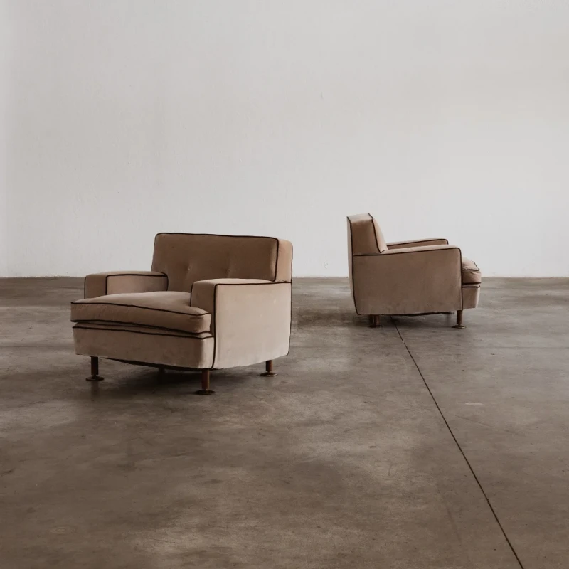 Considered one of the fathers of Italian industrial design together with Studio BBPR, Franco Albini, and Gio Ponti, Zanuso’s design balances strong geometric forms with a sense of lightness, achieved through the use of elevated, slender legs in dark wood, which taper delicately to rounded feet made of wood, offering both stability and a subtle material contrast. The sofa belongs to the first edition of “Regent”, visible by the use of circular wooden feet – though the later editions show iron feet. These thoughtful details reflect Zanuso’s philosophy of combining function with visual impact, making these armchairs a standout piece in classy interior settings.