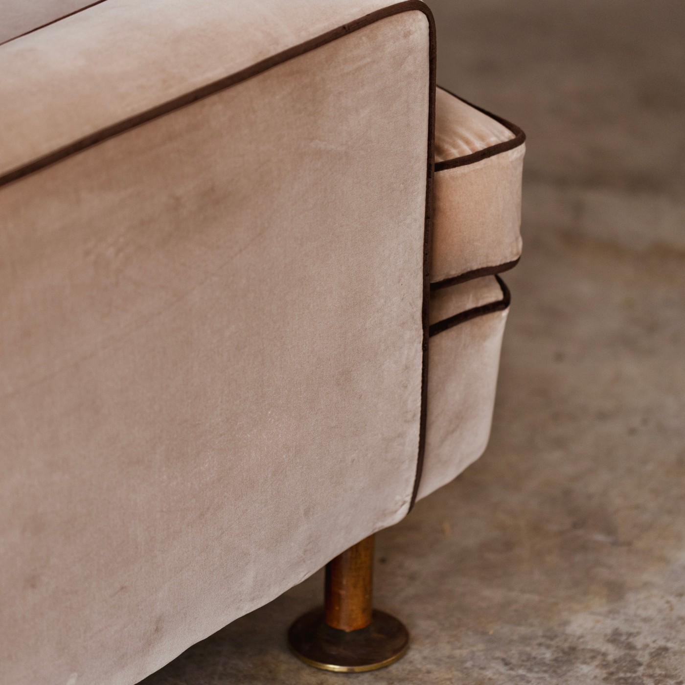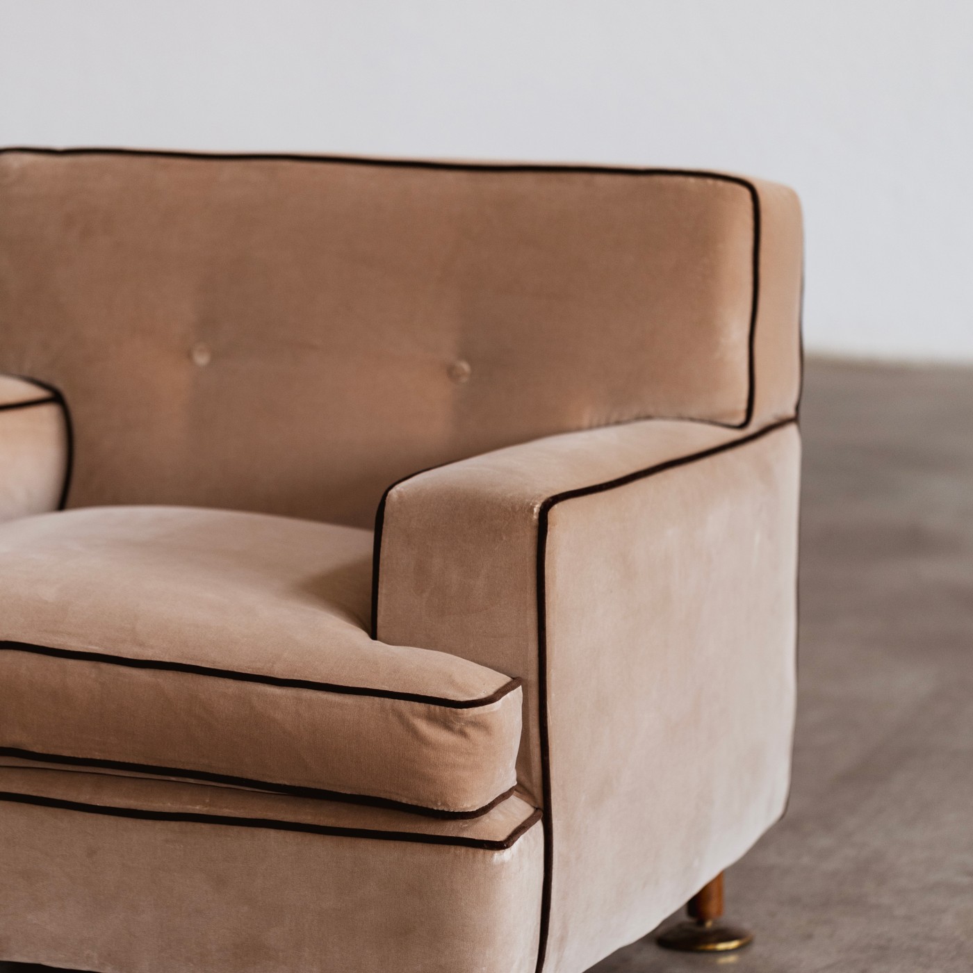 The design of Marco Zanuso’s “Square” sofa, produced for Arflex in 1960s, reflects his commitment to modernist design and innovation. The sofa, restored and reupholstered in the natural tones of beige with a dark brown decorative cord on the cushions and armrests, showcases a high, comfortable backrest that evokes the classic club style, combining formal elegance with functional comfort. The legs, crafted from turned dark wood and enameled black metal, create a balanced structure that supports the minimalist form. Zanuso, known for his collaborations with Arflex and experimentation with new materials, approached this project with his signature focus on ergonomics and industrial production techniques. The “Square” series highlights his ability to blend sculptural aesthetics with everyday usability, a hallmark of his work from the 1960s. His design philosophy, which aimed to enhance both comfort and durability, is evident in the sofa’s clean lines and resilient structure.
