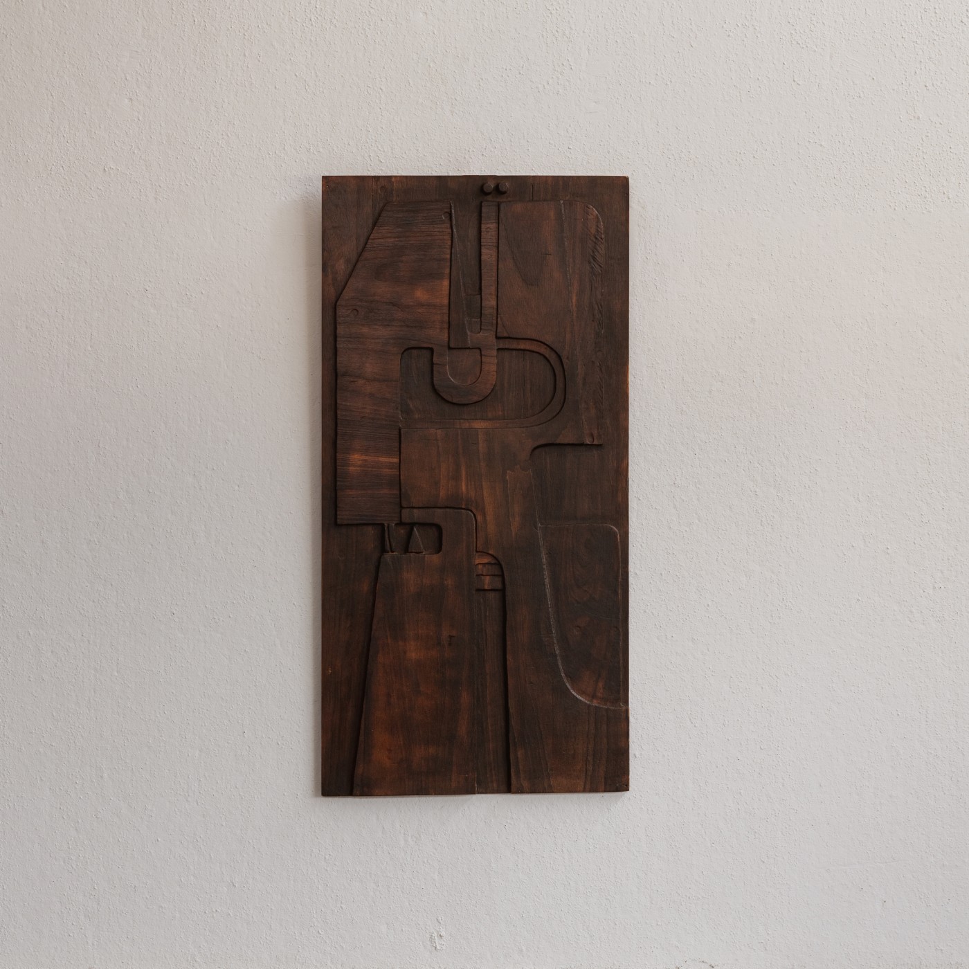 This untitled sculpture panel, created by Nerone & Patuzzi around 1970, is a unique piece crafted from vertically oriented mahogany. The panel features curved, triangular, and linear motifs with a megalithic flavor. The interplay of light and shadow defines the full and empty spaces of the sculptural form, creating zones of shadow and enhancing the perception of the figures. The different wood grains add to this effect, creating a sense of movement and enhancing the perception.