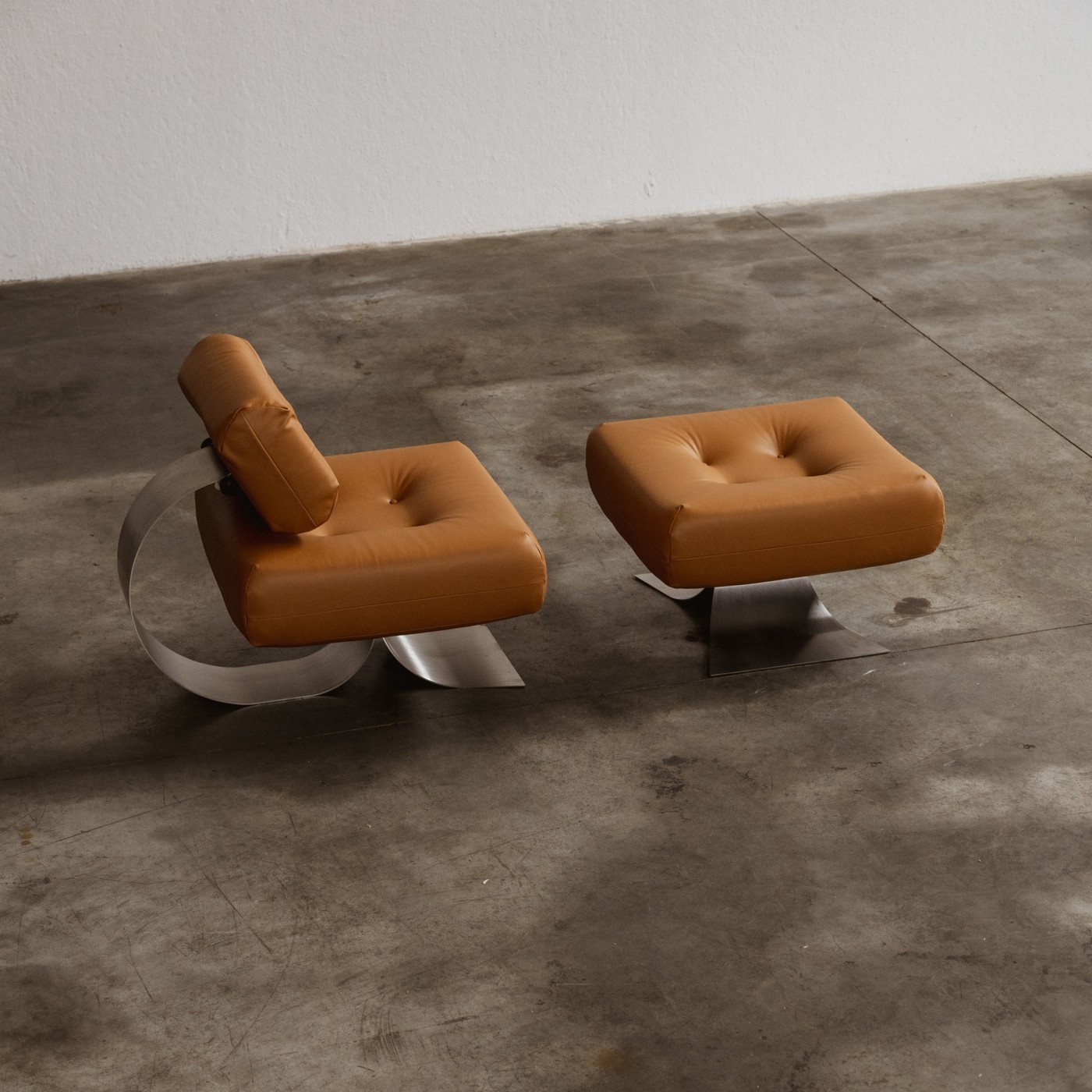 The “Alta” lounge chair, designed by Oscar Niemeyer in 1971 in collaboration with his daughter Anna Maria, embodies the essence of Brazilian modernist design. The chair and ottoman’s structure is crafted from curved steel bands that form a ribbon-like shape, supporting the seat and backrest. The adjustable inclination of both the seat and backrest creates a dynamic, almost spring-like effect, offering both comfort and flexibility. The dark beige leather upholstery, meticulously fitted, adds an element of luxury. Delicate button-tufted details create a geometric pattern that echoes Niemeyer’s architectural approach to form and function.