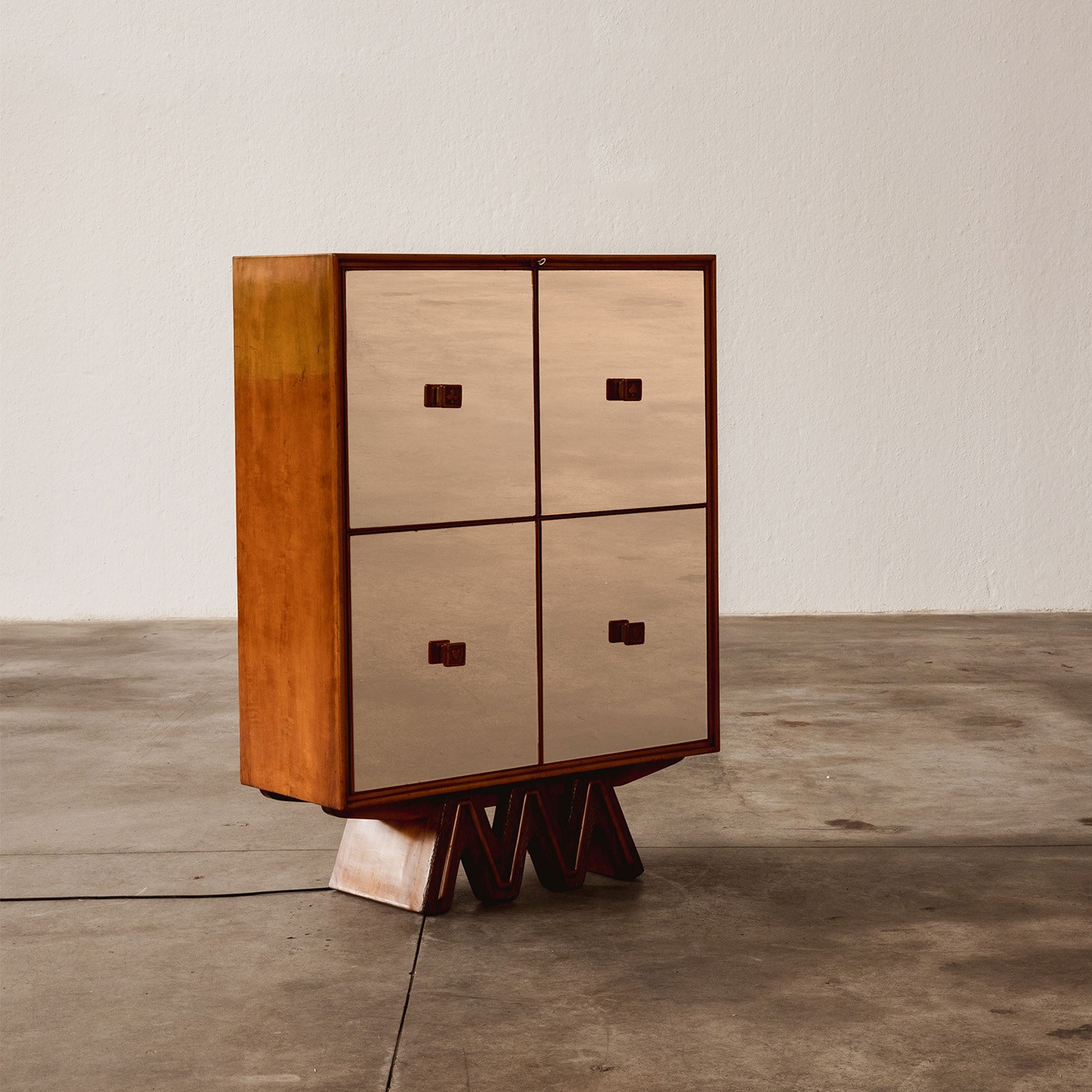 The creative mind merged with the art of craftsmanship of Osvaldo Borsani is explicitly visible in this Art Deco mirrored bar cabinet, a unique piece custom-made for a Villa in 1939 in Lake Como, Italy. Inspired by the model “5142” and entirely hand-made, this cabinet is perched elegantly on a wooden carved Decò wave base, showing timeless sophistication. The powerful Ace of Spades detail on each handle adds a touch of intrigue, reminiscent of an era filled with mystery and allure. Crafted with mid-century modern charm, its glass and mirrored surfaces capture the essence of opulence. Internal vertical golden mosaic strips adorn the polished mahogany structure, while a delicate feather door reveals its inner treasures. Inside, Borsani showcases a meticulously designed layout with four compartments and an exquisite retractable crystal shelf. Gilt brass fittings add a regal finish, merging modernity with vintage glamour. While also other renowned Italian designers of the age, like Gio Ponti and Paolo Buffa, produced some cabinets, none of them could reach the grace and ability of Osvaldo Borsani. This bespoke cabinet effortlessly complements various decor styles, making it a coveted classy centerpiece for any ambiance.