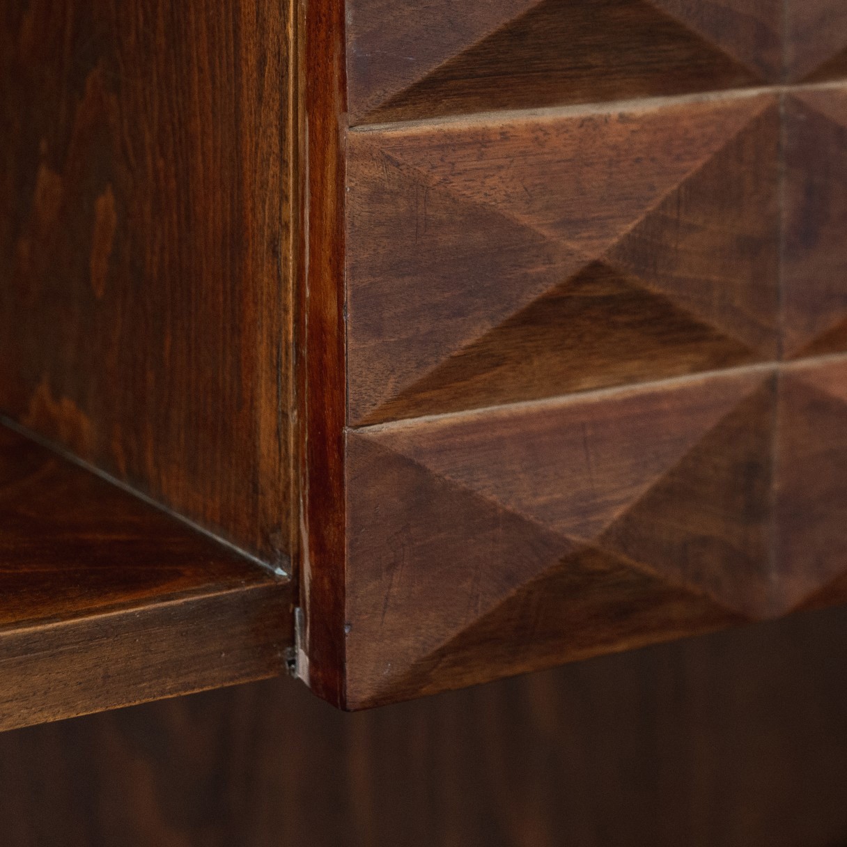 Designed by Paolo Buffa in 1952 for Serafino Arrighi, this buffet exemplifies the designer’s refined approach to mid-century Italian furniture, where functional clarity meets elegant craftsmanship. Intended as a sophisticated storage piece, the buffet features a front façade adorned with pyramid-shaped faceted elements, creating a subtle geometric texture that animates its surface. At the center, a single front door blends seamlessly into the patterned façade; when opened, it reveals a surprisingly spacious and refined interior—a classy storage solution lined with the same care and attention found on the exterior. Its structure relies on interlocking joinery, ensuring both visual harmony and structural integrity, while a rectangular stretcher beneath incorporates a linear decorative motif that echoes classical design principles. The sculptural legs offer architectural stability and contribute to the piece’s poised, clean profile.